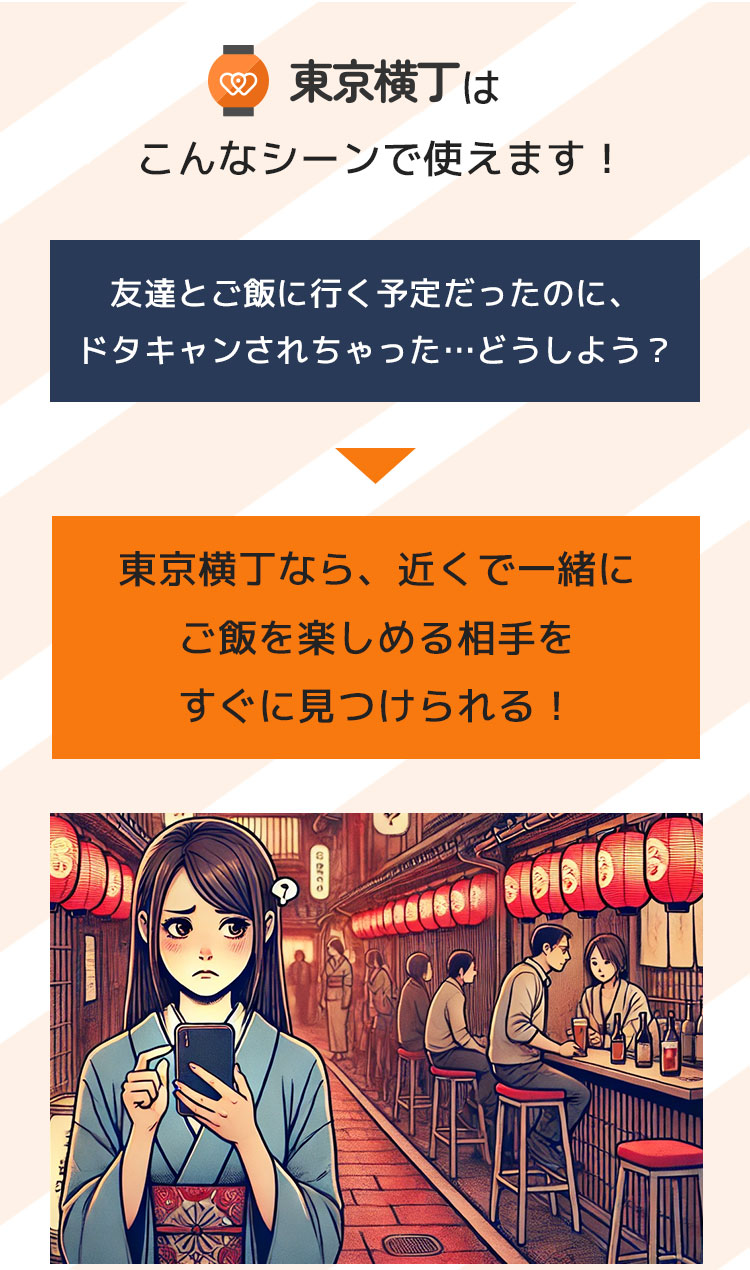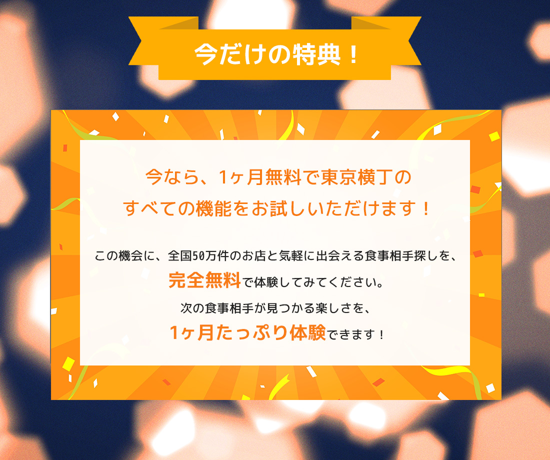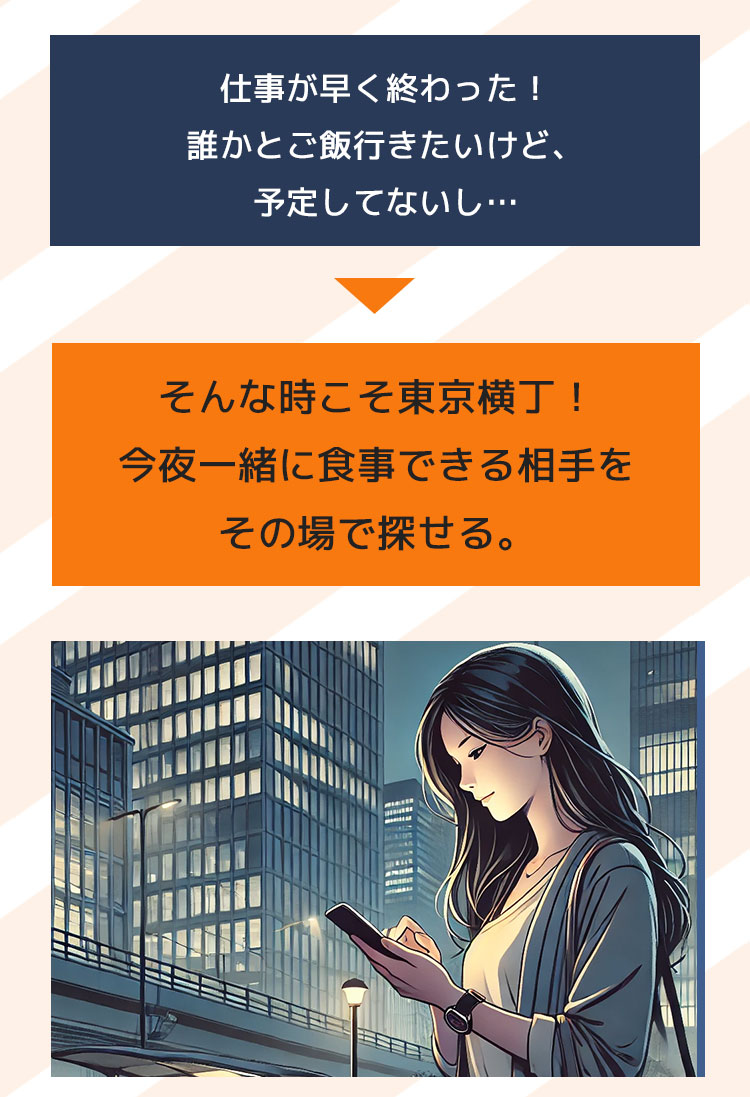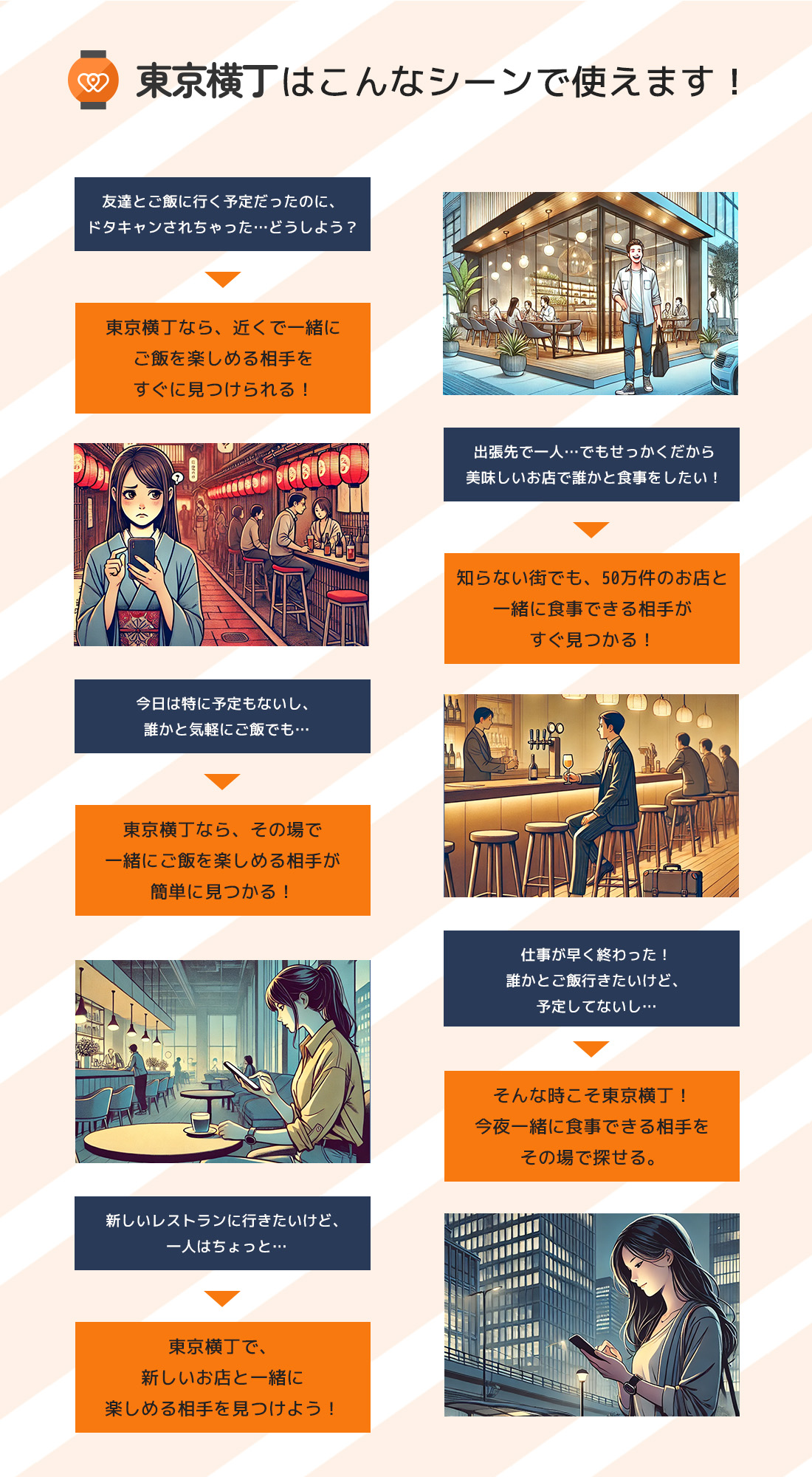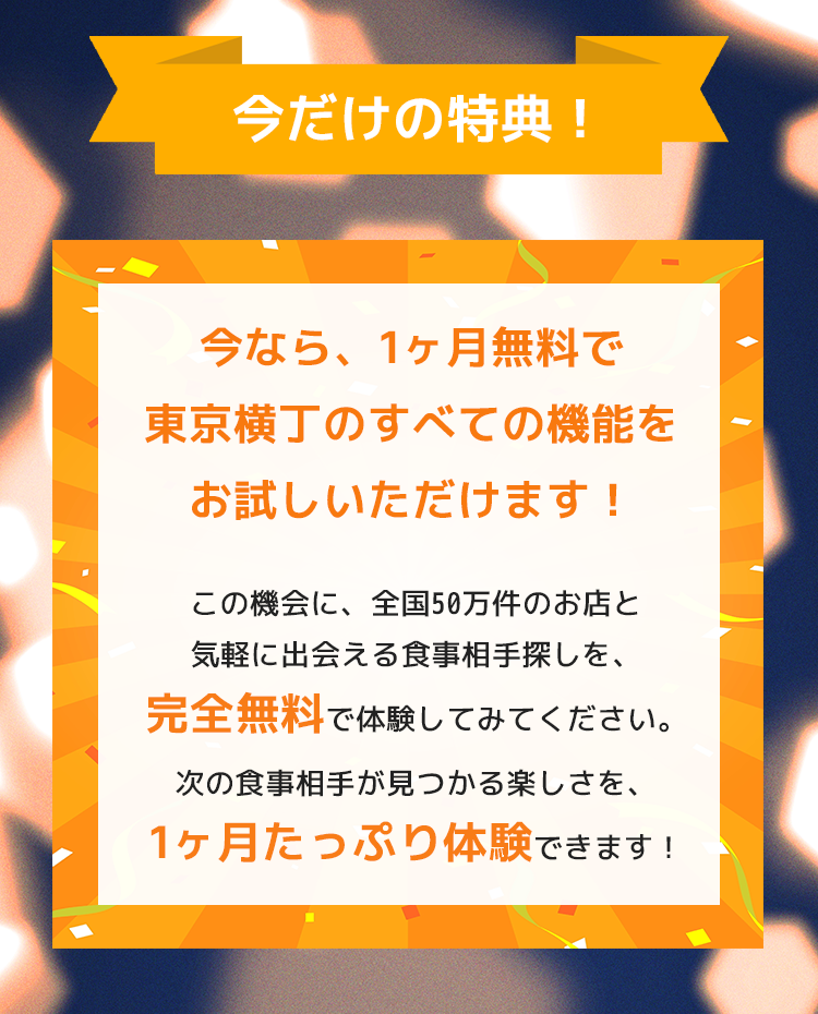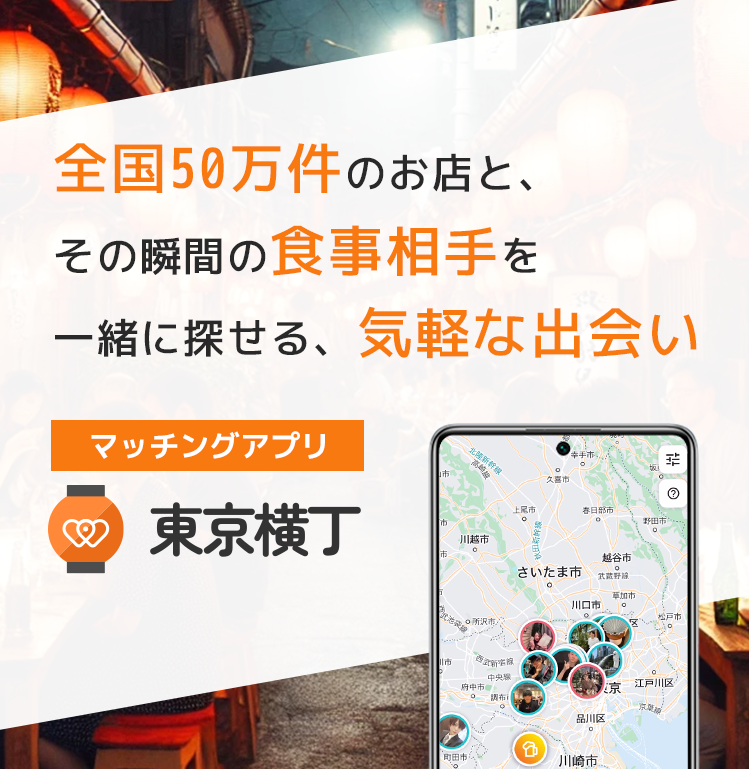 アプリは無料ですか? 東京横丁は、最初のひと月は無料でお試しいただけます!その後は月額4,000円で、全国50万件以上のお店の情報や、食事相手のマッチング機能が無制限でご利用いただけます。まずは1ヶ月、気軽に試してみてください。無料トライアル期間中もすべての機能が使えるので、たっぷりと体験できますよ! どうやって食事相手とマッチングするの? マッチングは簡単!お好きなお店を選んで、近くで同じように食事を楽しみたい人を探すだけです。近くのユーザーが地図上に表示されるので、ワンタップでマッチング!チャットで連絡を取り合って、お店で合流するだけ。ひと月無料で、この便利な機能を好きなだけお試しください! 急な予定変更やドタキャンがあった時でも使えますか? はい、東京横丁なら急な予定変更にも対応できます。ドタキャンされた時や、急に時間が空いた時でも、すぐに新しい食事相手を見つけられます。出張や旅行先でも大活躍!まずはひと月無料で、あらゆるシーンで役立つ便利さを体験してみてください。 アプリは無料ですか? 東京横丁は、最初のひと月は無料でお試しいただけます!その後は月額4,000円で、全国50万件以上のお店の情報や、食事相手のマッチング機能が無制限でご利用いただけます。まずは1ヶ月、気軽に試してみてください。無料トライアル期間中もすべての機能が使えるので、たっぷりと体験できますよ! どうやって食事相手とマッチングするの? マッチングは簡単!お好きなお店を選んで、近くで同じように食事を楽しみたい人を探すだけです。近くのユーザーが地図上に表示されるので、ワンタップでマッチング!チャットで連絡を取り合って、お店で合流するだけ。ひと月無料で、この便利な機能を好きなだけお試しください! 急な予定変更やドタキャンがあった時でも使えますか? はい、東京横丁なら急な予定変更にも対応できます。ドタキャンされた時や、急に時間が空いた時でも、すぐに新しい食事相手を見つけられます。出張や旅行先でも大活躍!まずはひと月無料で、あらゆるシーンで役立つ便利さを体験してみてください。 Instagram Tiktok X-twitter