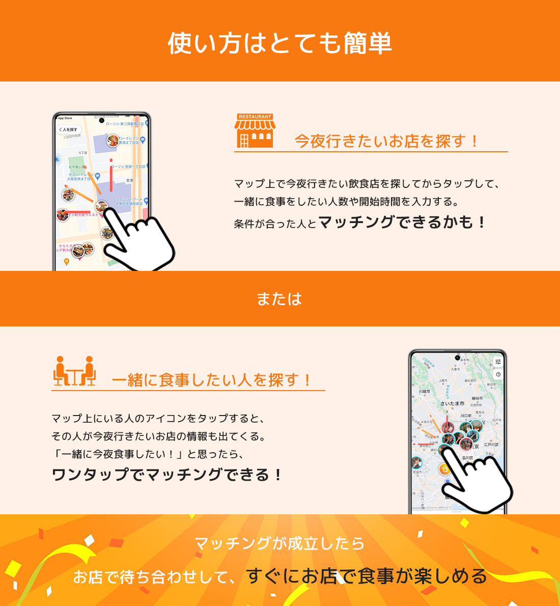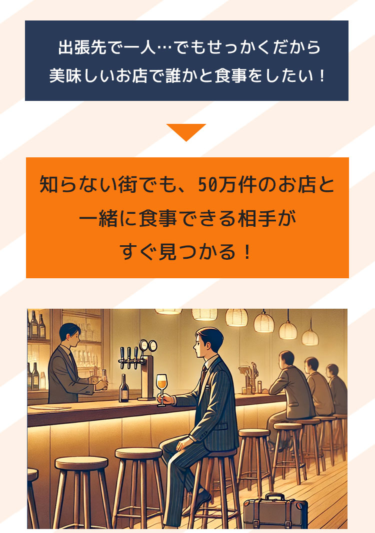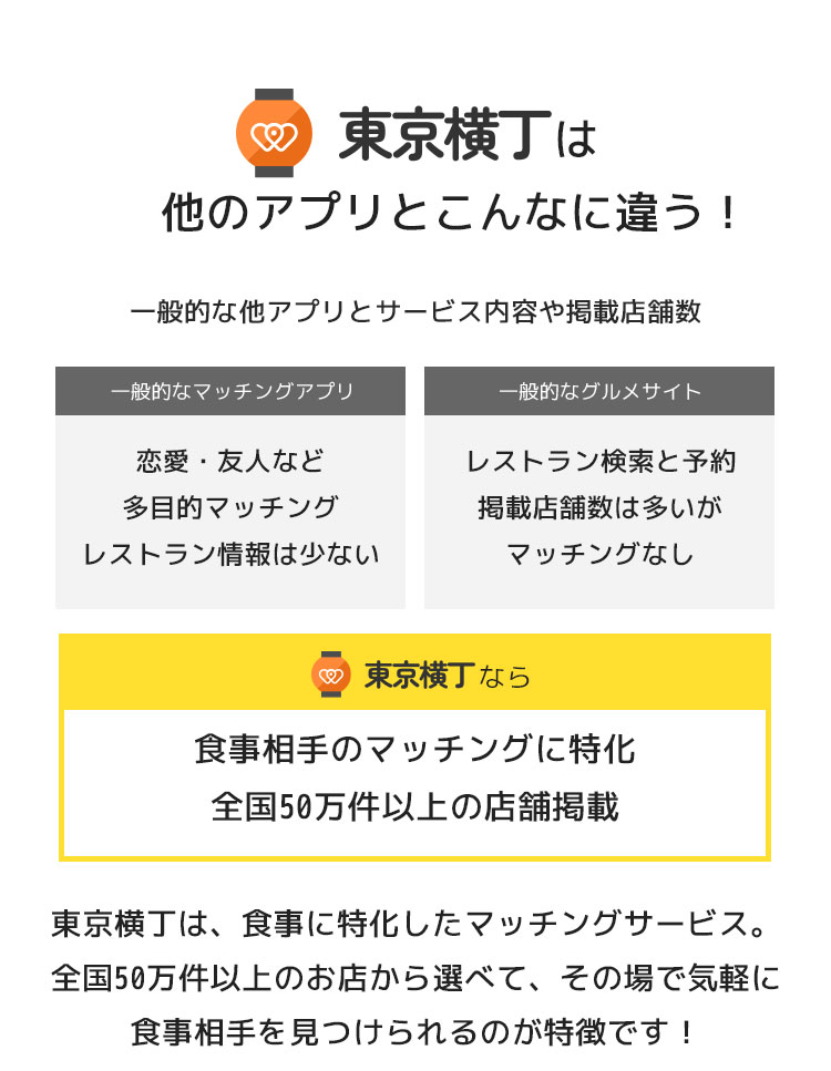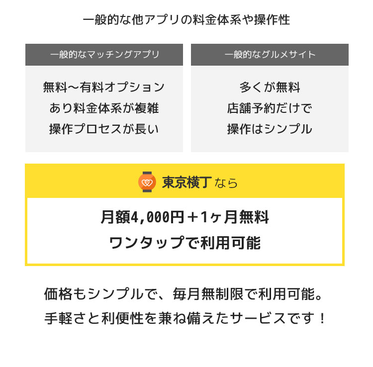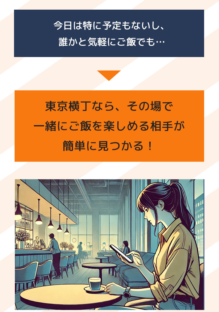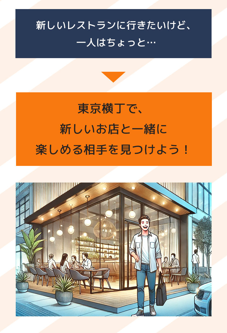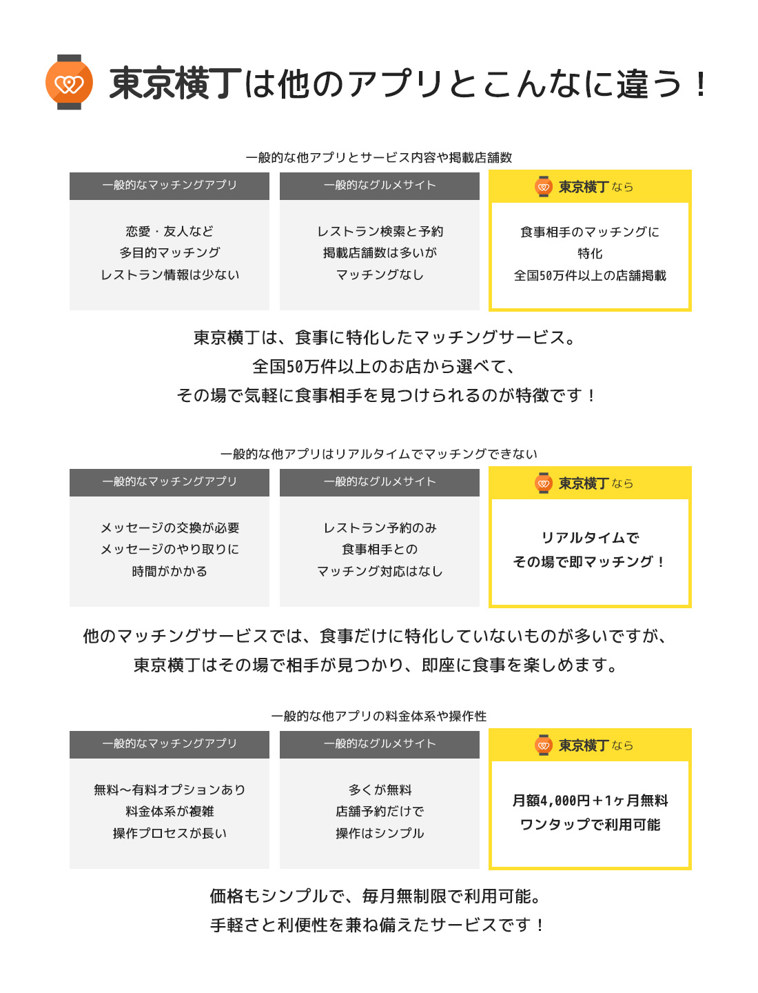 アプリは無料ですか? 東京横丁は、最初のひと月は無料でお試しいただけます!その後は月額4,000円で、全国50万件以上のお店の情報や、食事相手のマッチング機能が無制限でご利用いただけます。まずは1ヶ月、気軽に試してみてください。無料トライアル期間中もすべての機能が使えるので、たっぷりと体験できますよ! どうやって食事相手とマッチングするの? マッチングは簡単!お好きなお店を選んで、近くで同じように食事を楽しみたい人を探すだけです。近くのユーザーが地図上に表示されるので、ワンタップでマッチング!チャットで連絡を取り合って、お店で合流するだけ。ひと月無料で、この便利な機能を好きなだけお試しください! 急な予定変更やドタキャンがあった時でも使えますか? はい、東京横丁なら急な予定変更にも対応できます。ドタキャンされた時や、急に時間が空いた時でも、すぐに新しい食事相手を見つけられます。出張や旅行先でも大活躍!まずはひと月無料で、あらゆるシーンで役立つ便利さを体験してみてください。 アプリは無料ですか? 東京横丁は、最初のひと月は無料でお試しいただけます!その後は月額4,000円で、全国50万件以上のお店の情報や、食事相手のマッチング機能が無制限でご利用いただけます。まずは1ヶ月、気軽に試してみてください。無料トライアル期間中もすべての機能が使えるので、たっぷりと体験できますよ! どうやって食事相手とマッチングするの? マッチングは簡単!お好きなお店を選んで、近くで同じように食事を楽しみたい人を探すだけです。近くのユーザーが地図上に表示されるので、ワンタップでマッチング!チャットで連絡を取り合って、お店で合流するだけ。ひと月無料で、この便利な機能を好きなだけお試しください! 急な予定変更やドタキャンがあった時でも使えますか? はい、東京横丁なら急な予定変更にも対応できます。ドタキャンされた時や、急に時間が空いた時でも、すぐに新しい食事相手を見つけられます。出張や旅行先でも大活躍!まずはひと月無料で、あらゆるシーンで役立つ便利さを体験してみてください。 Instagram Tiktok X-twitter